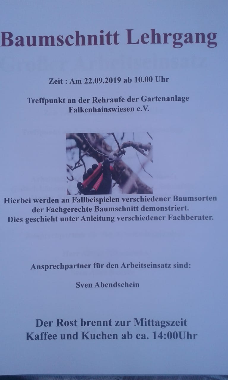 | Bild des Aushanges anklicken | Am 22. September hatte der Vorsitzende des KGV In den Falkenhainswiesen, Gfrd. Sven Abendschein die Pächter zu einer Vorführung Baumschnitt eingeladen. Unterstützt wurde er dabei von der Ltrn. der AG Fachberater, Gfrdn. Ina Wagner sowie vom Fachberater des Vereines Gfrd. Harald Schindler. Zahlreiche Gartenfreunde nahmen diese Einladung an, zumal nach der Vorführung der Tag mit einem geselligem Beisammensein ausklang. Eine gelungene Schulung - verbunden mit einem Arbeitseinsatz - zur Nachahmung empfohlen. |