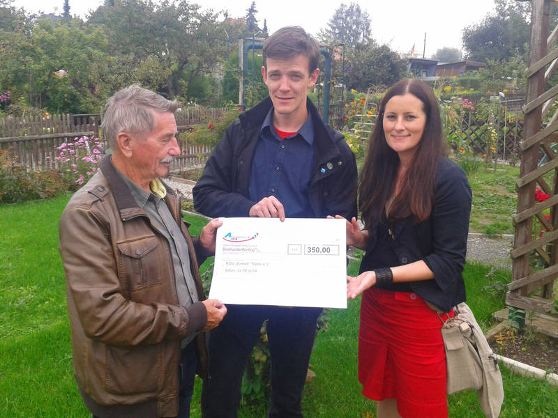 und Sein der Gartenanlage erläutert und auch dokumentiert. Sehr angetan waren die Gäste über das Projekt "Kleine Gärtner", und das sich der gesamte Verein mit dieser Problematik befasse und auch unterstütze. Im Laufe dieser Begegnung wurde dem Vereinsvorstand zugesichert, dass man das Projekt "Kleine Gärtner" finanziell unterstützen werde. So konnte der Vorstand am 04.09.2014 einen Scheck ,der von der "Alternative 54 Erfurt e.V " ausgestellt war, in Empfang nehmen. Der Vorsitzende des Vereines Gfrd. Rudolf Gröger bedankte sich im Namen seiner Vereinsmitglieder und ganz besonders seiner "Kleinen Gärtner" für diese finanzielle Unterstützung. Damit können die beiden Objekte, das "Grüne Klassenzimmer" sowie der "Lehr- und Spielgarten" fertig gestellt werden. | |